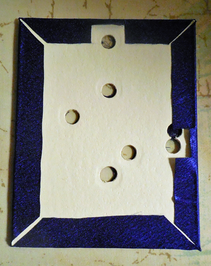 non-washable, no sew, fabric covered photo frame using mat board parts tutorial, however, with 2 holes on the easel back mat board panel & 2 holes on the top part of the strut leg board panel, to thread ribbon through their holes, to connect the 2, that's only difference, and you can hole punch them out with a quality hole puncher, that has a longer reach, or use the pointy end of small, pointy scissors, to poke them out, use the paper print outs, align over the cut boards and poke through where the holes are through to the boards. Use tape to hold the pattern in place on the board.